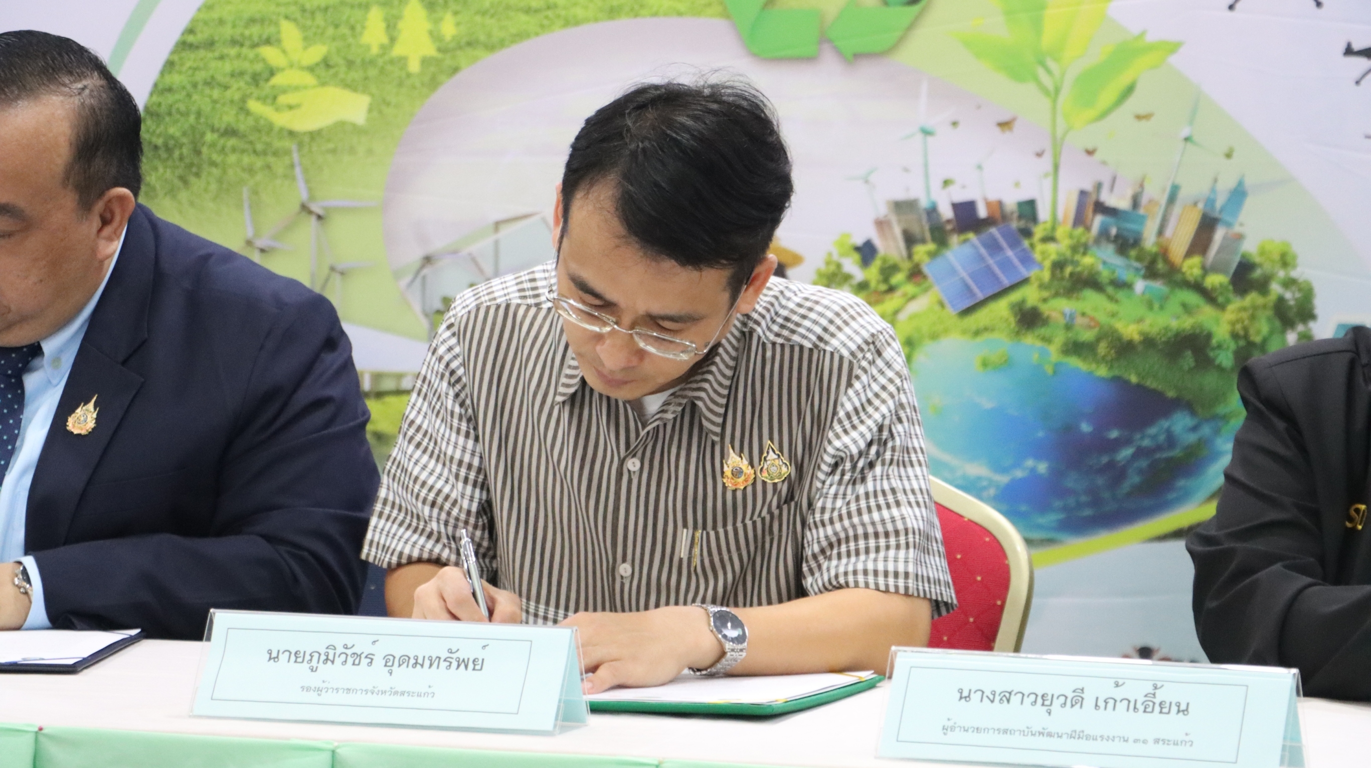 พิธีลงนามความร่วมมือ (MOU) ด้านวิชาการ โครงการ "การพัฒนานวัตกรรมรูปแบบการเรียนรู้ยกระดับห่วงโซ่คุณค่าเศษวัสดุเหลือทิ้งทางการเกษตรแก้ไขปัญหาอาชีพกลุ่มเปราะบางและผู้..